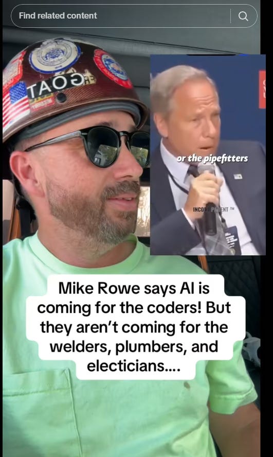 Usually you see this bullshit from America’s favorite blue collar dad, Mike Rowe. But when he says, “We’ve been telling kids for 15 years to learn to code… well, AI’s coming for the coders. It’s not coming for the welders, plumbers, HVAC techs or electricians,” well, that’s a dangerous oversimplification. Rowe’s quote is half-history, half-hype: “Learned trades aren’t going away?” Sure, for now. But thinking AI won’t affect the trades and future workers is just lazy thinking. Rowe completely ignores the necessary adaptation and skill transformation required for long-term career resilience in these fields.