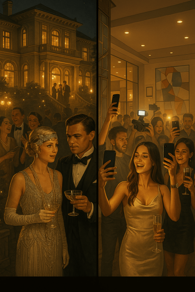 Gatsby embraced the idea of spinning up a “personal brand” from scratch. He created an entire persona, mysterious and magnetic, just to win the love of someone always out of reach, and a social circle full of people who will never let him in. He threw wild parties, built a myth from gossip, and let rumor turn into reality. He was an influencer. He was a living, breathing meme.